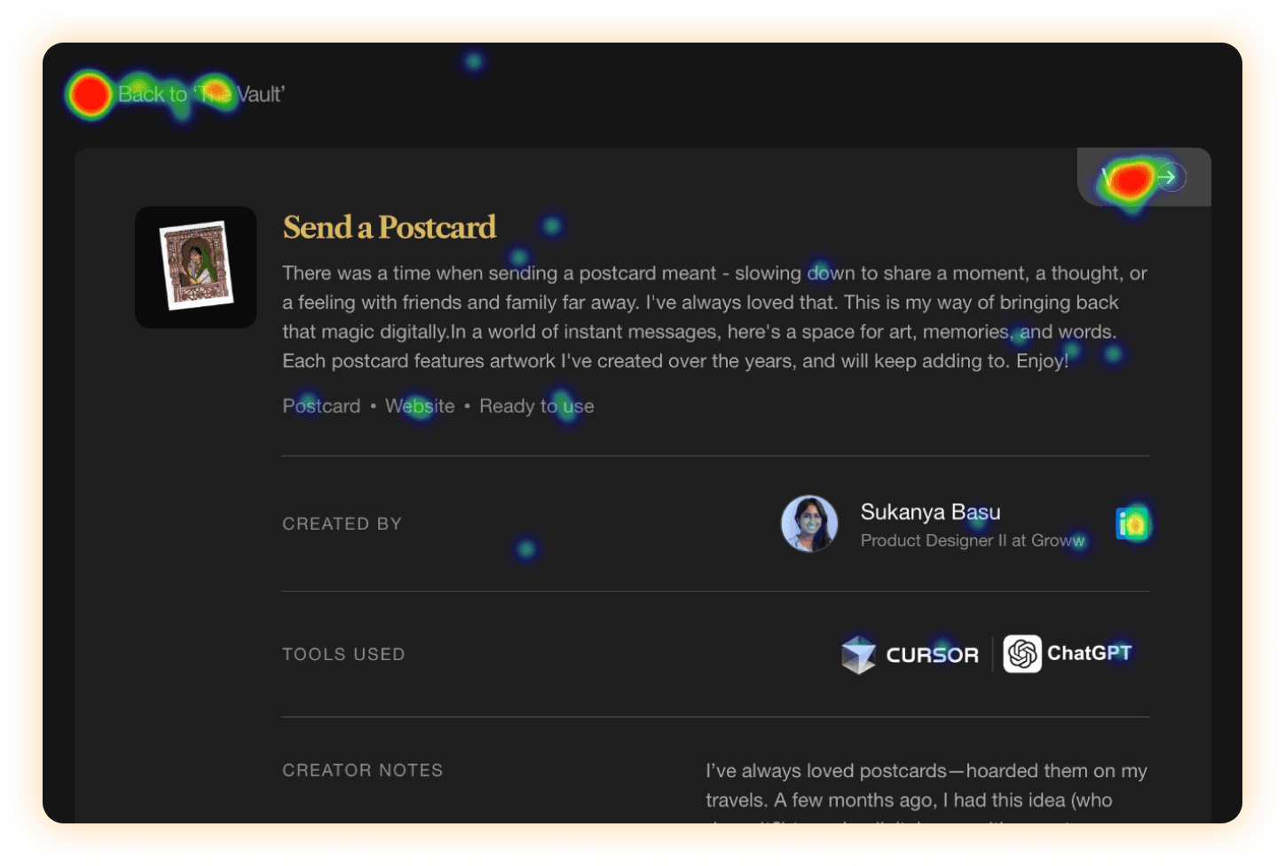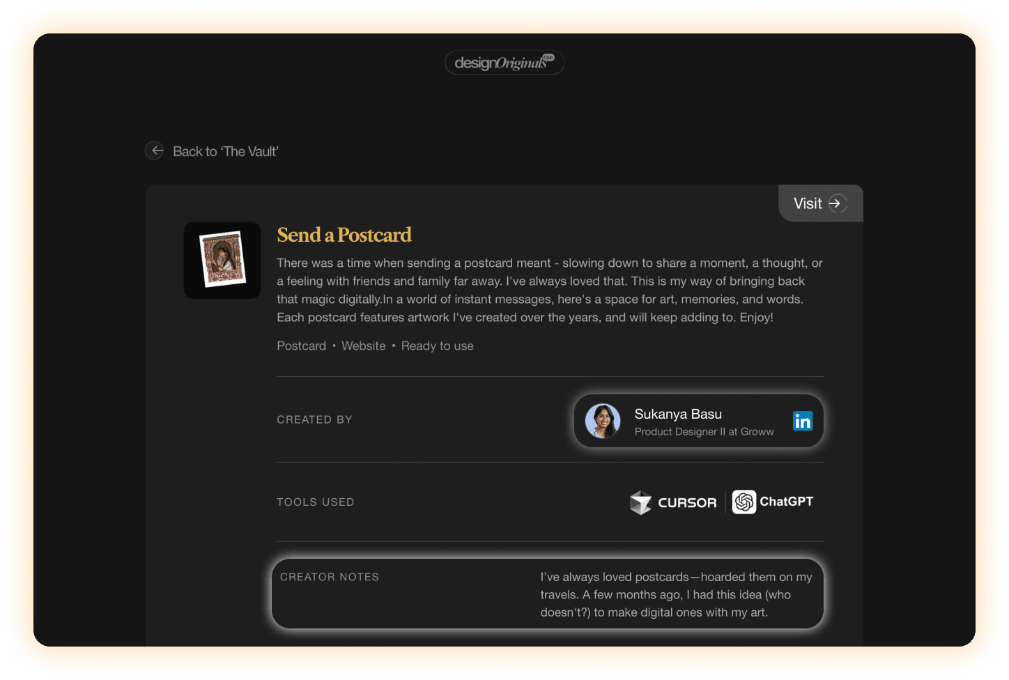 behind that work. So we added a LinkedIn button for easy connection and a small creator notes section